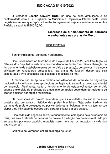 Célio baseia seu pedido no texto-base do Projeto de Lei 295/22, em tramitação na Câmara dos Deputados, que trata da liberação de funcionamento de estabelecimentos comerciais e a prestação de serviços, incluindo a atividade de vendedores ambulantes, nas praias de Mucuri, desde que seja assegurada a livre circulação das pessoas e o acesso ao mar.