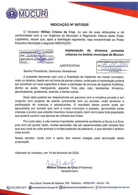 Em outro documento – Indicação nº 007/2025 -, Willian sugere a implantação de diversos pomares urbanos em todo o Município.
