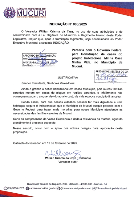 Parceria do Município com o Governo Federal para construção de moradias, dentro do projeto habitacional Minha Casa, Minha Vida, foi proposta pelo Vereador Willian Crisma da Cruz (Willian Crisma – Podemos), por meio da Indicação nº 008/2025, durante a reunião da Câmara nesta terça-feira (25/02).