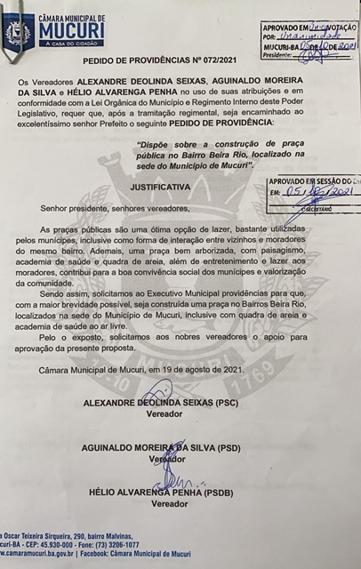 A construção de uma praça pública no bairro Beira Rio, em Mucuri, foi solicitada por meio do Pedido de Providência nº 072/2021, autoria conjunta dos Vereadores Alexandre Deolinda Seixas (Xandão Seixas – PSC), Aguinaldo Moreira da Silva (Aguinaldo Sem Teto – PSD) e Hélio Alvarenga Penha (Dr. Hélio da Fisioterapia – PSDB).