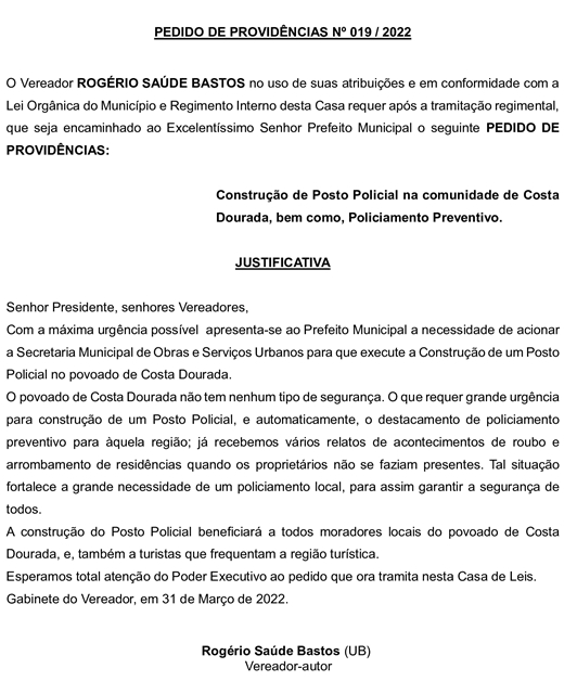 PEDIDO DE PROVIDÊNCIA Nº 019/2022