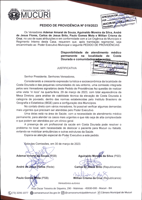 Na quarta-feira, 29 de março, uma comissão integrada por seis Vereadores esteve em Costa Dourada, litoral sul do Município, com a finalidade de verificar as principais demandas da população e subsidiar análise de viabilidade técnica de elevação da localidade à categoria de povoado, dentro das normas estabelecidas pelo Instituto Brasileiro de Geografia e Estatística (IBGE) para a configuração dos Municípios.