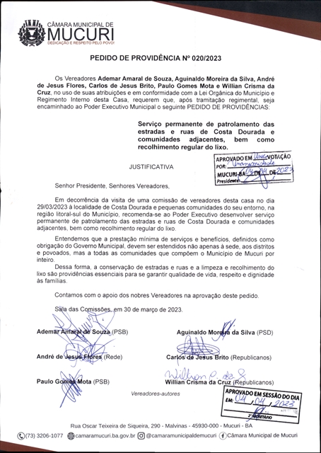 Com total apoio da Mesa Diretora, os Vereadores Ademar Amaral de Souza (Amaral – PSB), Aguinaldo Moreira da Silva (Aguinaldo Sem Teto – PSD), André de Jesus Flores (André do Sindicato – Rede), Carlos de Jesus Brito (Carlinhos da Ótica – Republicanos), Paulo Gomes Mota (Paulo do Carvão – PSB) e Willian Crisma da Cruz (Willian Crisma – Republicanos) ouviram atentamente os moradores e, inicialmente, elaboraram duas proposições direcionadas à melhoria da qualidade de vida de quem mora ou visita Costa Dourada: