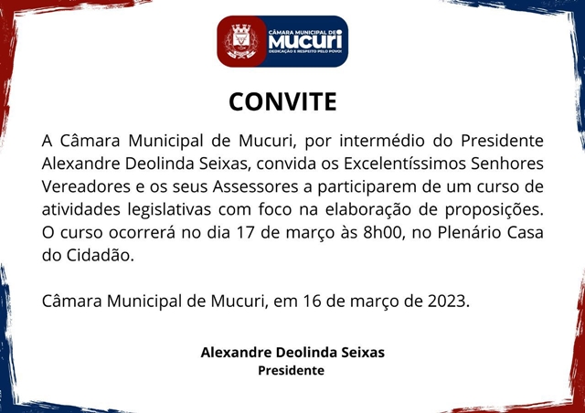 Por iniciativa do presidente Alexandre Deolinda Seixas (Xandão Seixas – PSC), a Câmara de Mucuri promoveu na manhã desta sexta-feira (17/03) um curso de atividades legislativas, destinado a vereadores e assessores. Finalidade é possibilitar uma melhor capacitação com foco na elaboração de proposições.