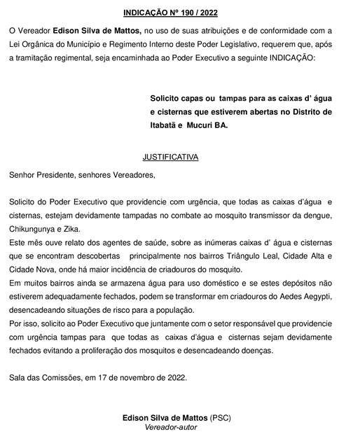 Todas as caixas d’água e cisternas precisam estar devidamente tampadas, no combate ao mosquito transmissor da dengue, chikungunya e zika. A preocupação é do Vereador Edison Silva Mattos (Sula – PSC), autor da Indicação nº 190/2022, aprovada na terça-feira passada (22), durante sessão da Câmara.