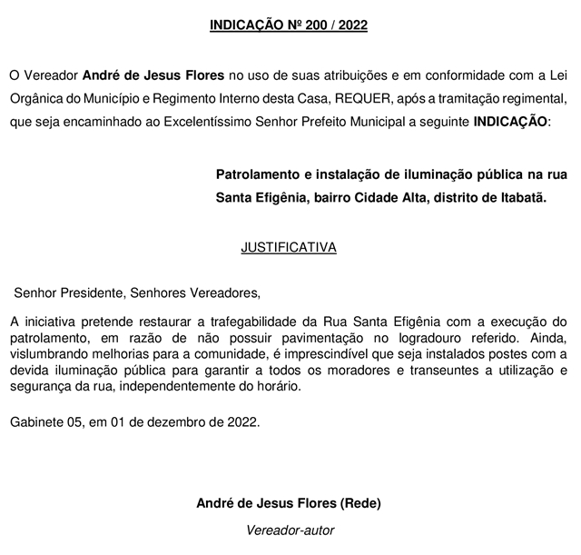Três proposições foram apresentadas pelo Vereador André de Jesus Flores (André do Sindicato – Rede) durante a sessão da última terça-feira (06/12) da Câmara, todas aprovadas por unanimidade e já encaminhadas ao Gabinete do Prefeito Municipal, para as providências que se fizerem necessárias.