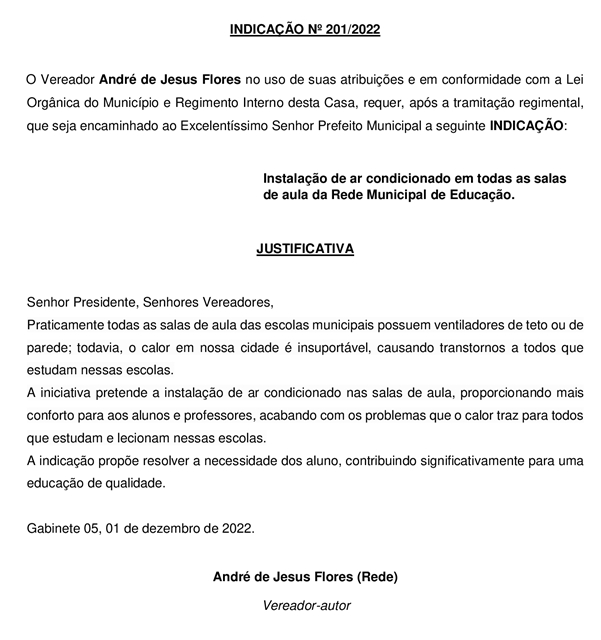 Instalação de ar condicionado em todas as salas de aula da Rede Municipal de Educação.