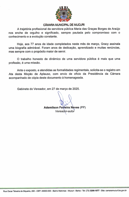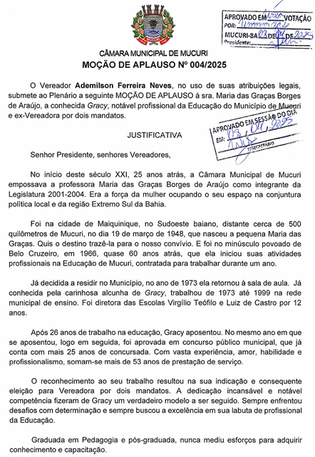 Maria das Graças Borges de Araújo, 77 anos, a conhecida Gracy, notável profissional da Educação do Município de Mucuri e ex-Vereadora por dois mandatos, foi condecorada com a Moção de Aplauso nº 004/2025, autoria do Vereador Ademilson Ferreira Neves (Dema – PP), durante a 5ª Reunião Ordinária, realizada terça-feira passada (08/04).