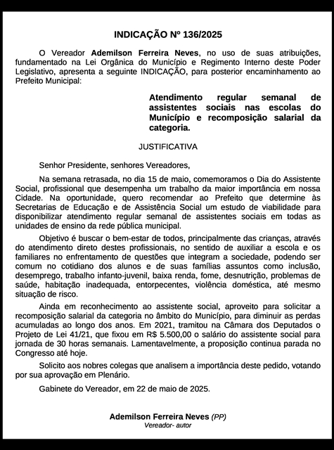 Foi no dia 15 de maio a comemoração do Dia do Assistente Social, profissional que desempenha um trabalho da maior importância em nosso Município. A data foi lembrada pelo vereador Ademilson Ferreira Neves (Dema – PP) na Indicação nº 136/2025, aprovada na reunião desta terça-feira (03/06), quando ele recomendou ao Prefeito que determine às Secretarias de Educação e de Assistência Social um estudo de viabilidade para disponibilizar atendimento regular semanal de assistentes sociais em todas as unidades de ensino da rede pública municipal.