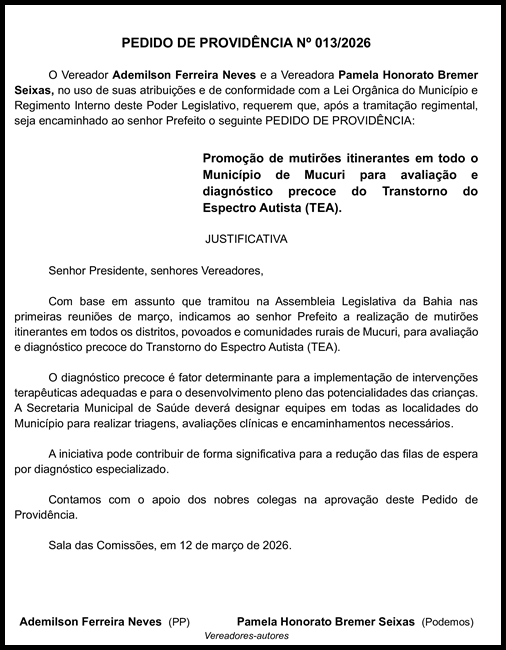 Todos os Vereadores presentes à sessão desta terça-feira (17/03) da Câmara aprovaram o Pedido de Providência nº 013/2026, que recomenda ao Prefeito a promoção de mutirões itinerantes em todo o Município de Mucuri para avaliação e diagnóstico precoce do Transtorno do Espectro Autista (TEA).
