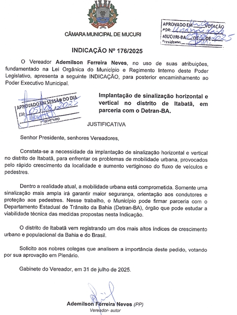 Constata-se a necessidade da implantação de sinalização horizontal e vertical no distrito de Itabatã, para enfrentar os problemas de mobilidade urbana, provocados pelo rápido crescimento da localidade e aumento vertiginoso do fluxo de veículos e pedestres. Nesse trabalho, o Município pode firmar parceria com o Departamento Estadual de Trânsito da Bahia (Detran-BA), órgão que pode estudar a viabilidade técnica das medidas propostas nesta Indicação.