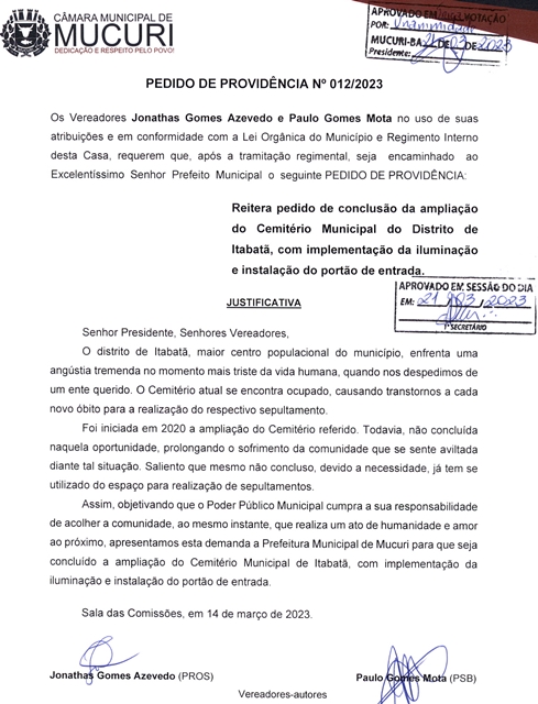 A conclusão das obras de ampliação do Cemitério Municipal do distrito de Itabatã, com iluminação e instalação do portão de entrada, foi solicitada na Câmara, durante a reunião de terça-feira passada (21/03), pelos Vereadores Jonathas Gomes Azevedo (Dhow da Divisa – PROS) e Paulo Gomes Mota (Paulo do Carvão – PSB).