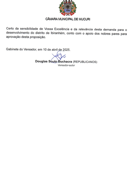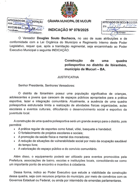 A Indicação nº 078/2025, assinada pelo Vereador Douglas Souto Buchacra (Douglas Dodô – Republicanos), leva ao Prefeito a necessidade de construção de uma quadra poliesportiva no distrito de Ibiranhém.