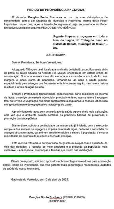 Douglas também é o autor do Pedido de Providência nº 032/2025, trata do serviço urgente de limpeza e roçagem em toda a área da Lagoa do Triângulo Leal, no distrito de Itabatã.