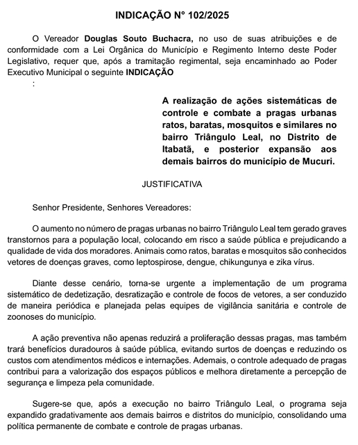 Assunto: A realização de ações sistemáticas de controle e combate a pragas urbanas ratos, baratas, mosquitos e similares no bairro Triângulo Leal, no distrito de Itabatã, e posterior expansão aos demais bairros do município de Mucuri.