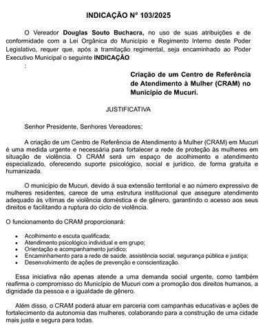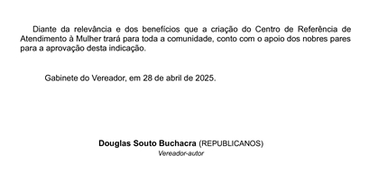 Douglas considera uma medida urgente e necessária para fortalecer a rede de proteção às mulheres em situação de violência. O CRAM será um espaço de acolhimento e atendimento especializado, oferecendo suporte psicológico, social e jurídico, de forma gratuita e humanizada.