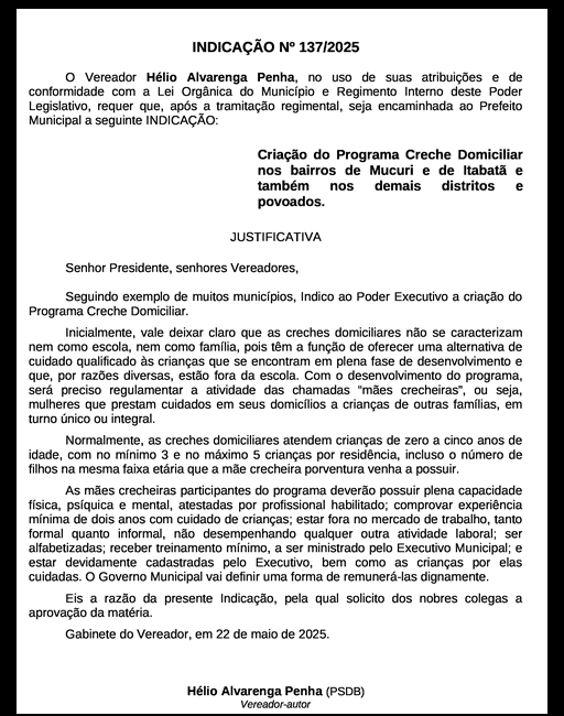 Na Indicação nº 137/2025, Dr. Hélio sugere a criação do Programa Creche Domiciliar nos bairros de Mucuri e de Itabatã e também nos demais distritos e povoados.
