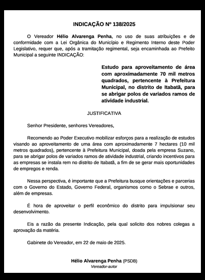 Estudo para aproveitamento de área com aproximadamente 70 mil metros quadrados, pertencente à Prefeitura Municipal, no distrito de Itabatã, para se abrigar polos de variados ramos de atividade industrial. Este é o assunto contido na Indicação nº 138/2025, autoria do presidente da Câmara, Hélio Alvarenga Penha (Dr. Hélio – PSDB), aprovada na reunião da manhã desta terça-feira (03/06).