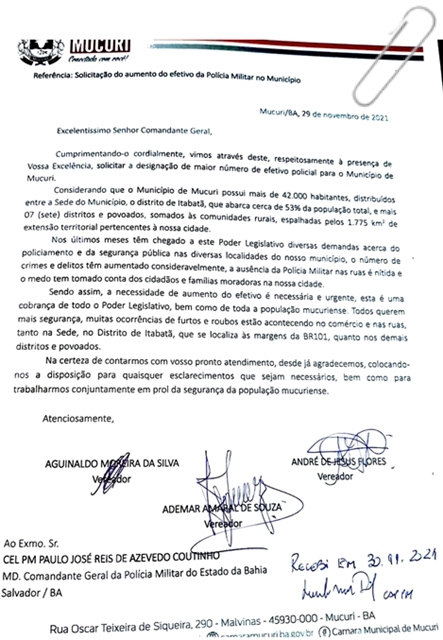 O ofício deixa claro: “A necessidade de aumento do efetivo é necessária e urgente. Esta é uma cobrança de todo o Poder Legislativo, bem como de toda a população mucuriense.”