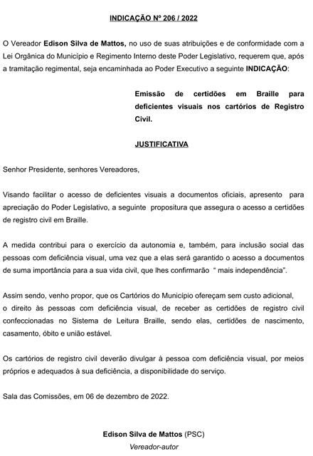 Aprovada durante a sessão dessa terça-feira (13/12) na Câmara de Mucuri a Indicação nº 206/2022, de autoria do Vereador Edison Silva de Mattos (Sula – PSC), que trata da emissão de certidões em braille para deficientes visuais nos cartórios de Registro Civil.
