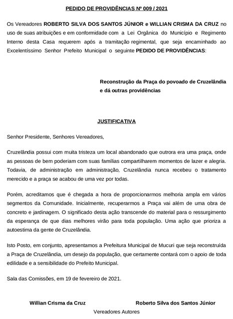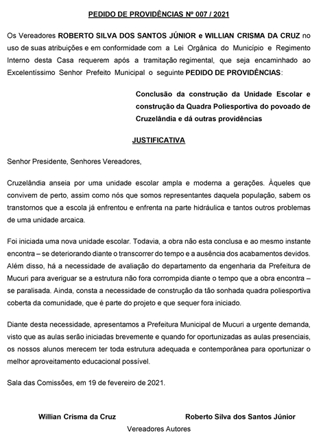 Autoria conjunta dos Vereadores Roberto Silva dos Santos Júnior, o Roberto Jr. (DEM), e Willian Crisma da Cruz, o Willian Crisma (Republicanos), resultou na apresentação de dois Pedidos de Providências, ambos aprovados por unanimidade, em favor do povoado de Cruzelândia, durante a Reunião da Câmara realizada dia 9, terça-feira passada.