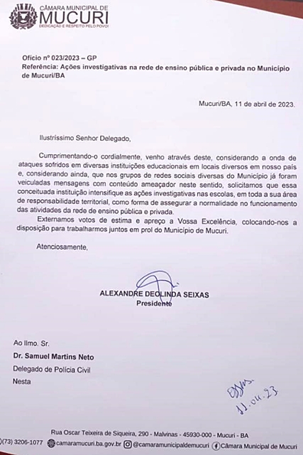 Além dos ofícios enviados ao comandante da 89ª Companhia Independente da Polícia Militar (89ª CIPM), major PM Eduardo Fabrício Galvão da Silva, e ao secretário municipal de Educação, Dalmo Costa de Souza, na terça-feira (11/04) o presidente Alexandre Deolinda Seixas (Xandão Seixas – PSC) encaminhou o Ofício nº 023/2023-GP ao delegado de Polícia Civil de Mucuri, Samuel Martins Neto, apontando a urgência da realização de ações investígativas na rede de ensino pública e privada do Município.