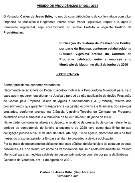 Foram dois Pedidos de Providências assinados pelo Vereador Carlos de Jesus Brito (Carlinhos da Ótica – Republicanos), que envolvem o trabalho prestado pela Empresa Baiana de Águas e Saneamento S.A. (Embasa) no Município, aprovados por unanimidade na Câmara, durante a sessão de terça-feira passada (21/9).