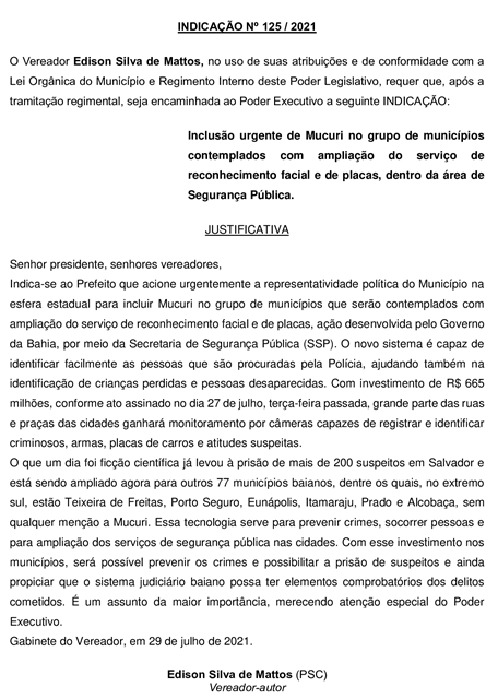 Assunto: Inclusão urgente de Mucuri no grupo de municípios contemplados com ampliação do serviço de reconhecimento facial e de placas, dentro da área de Segurança Pública.