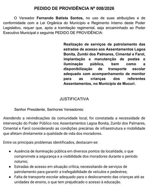 PEDIDOS DE PROVIDÊNCIAS Nº 008/2026