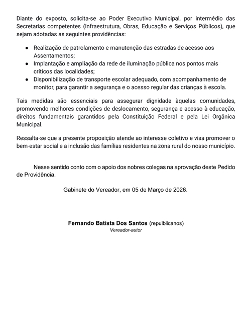Fernando cobra providências, como: realização de patrolamento e manutenção das estradas de acesso aos Assentamentos; implantação e ampliação da rede de iluminação pública nos pontos mais críticos das localidades; e