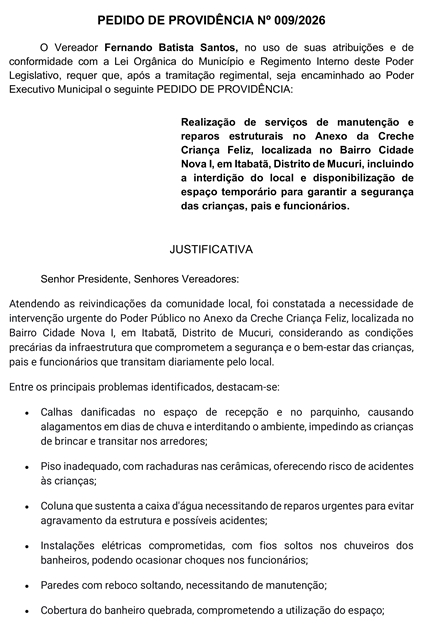 PEDIDO DE PROVIDÊNCIAS Nº 009/2026