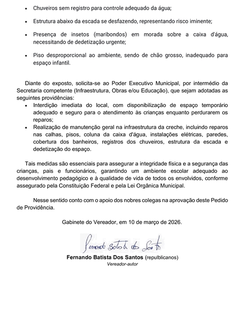 Durante a 4ª Reunião Ordinária, nesta terça-feira (17/03), o Vereador Fernando Batista dos Santos (Fernando da Gazzinelli – Republicanos) apresentou dois importantes Pedidos de Providências que visam solucionar problemas críticos nas áreas de transportes e educação.