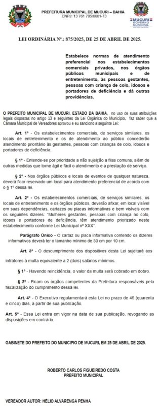 Uma nova lei municipal entra em vigor a partir desta sexta-feira, 25 de abril, em Mucuri. É a Lei Ordinária nº 875/2025, que estabelece normas de atendimento preferencial nos estabelecimentos comerciais privados, nos órgãos públicos municipais e de entretenimento, às pessoas gestantes, pessoas com criança de colo, idosos e portadores de deficiência. A lei foi sancionada pelo prefeito Roberto Carlos Figueiredo Costa (União Brasil) e nasce do Projeto de Lei Ordinária nº 004/2025, de autoria do Presidente da Câmara, Hélio Alvarenga Penha (Dr. Hélio – PSDB), aprovado por todos os vereadores na sessão do dia 08 de abril.