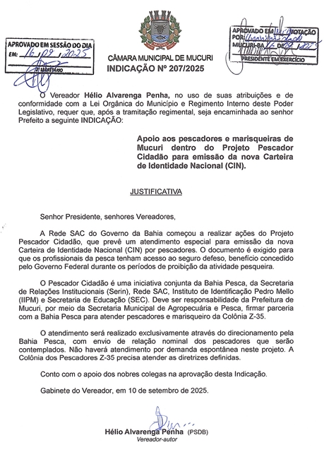 A Indicação nº 207/2025, apresentada na reunião de terça-feira (16/09) pelo Presidente Hélio Alvarenga Penha (Dr. Hélio – PSDB), trata do assunto, lembrando que a Rede SAC do Governo da Bahia já começou a realizar ações do Projeto Pescador Cidadão, que prevê um atendimento especial para emissão da nova Carteira de Identidade Nacional (CIN) por pescadores. O documento é exigido para que os profissionais da pesca tenham acesso ao seguro defeso, benefício concedido pelo Governo Federal durante os períodos de proibição da atividade pesqueira.