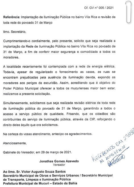 Nesta segunda-feira (29), dois dias antes da data histórica atribuída à fundação do povoado de 31 de Março (Divisa), o Vereador Jonathas Gomes Azevedo (Dhow da Divisa – PROS) encaminhou ofício à Prefeitura de Mucuri, endereçado ao engenheiro Victor Augusto Souza Santos, que responde pela Secretaria de Obras e, também, pela Secretaria de Transporte, Limpeza e Iluminação Pública.