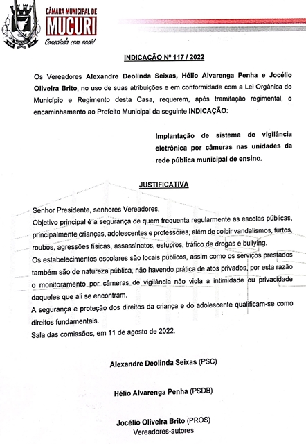 Os Vereadores Alexandre Deolinda Seixas (Xandão Seixas – PSC), Hélio Alvarenga Penha (Dr. Hélio – PSDB) e Jocélio Oliveira Brito (Célio Pebas – PROS) uniram forças e assumiram autoria da Indicação nº 117/2022, aprovada na Reunião de 16/08, que trata da implantação de sistema de vigilância eletrônica por câmeras nas unidades da rede pública municipal de ensino.