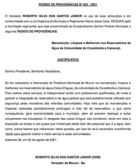 Foi com o Pedido de Providência Nº 053/2021, apresentado na reunião de terça-feira passada (10/8), que o Vereador Roberto Silva dos Santos Junior (Roberto Jr. – DEM) alertou para a necessidade de execução dos serviços de manutenção, limpeza e melhorias nos reservatórios de água das comunidades de Cruzelândia e Camarugi, região sul do Município.
