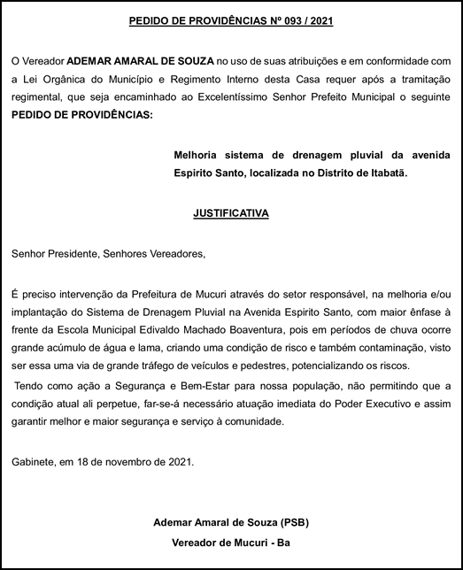 Um antigo problema de infraestrutura urbana de Itabatã permanece como preocupação do Vereador Ademar Amaral de Souza (Amaral – PSB), que, na reunião de terça-feira passada (23/11) da Câmara, apresentou o Pedido de Providência nº 093/2021, cobrando do Governo Municipal a melhoria sistema de drenagem pluvial da Avenida Espirito Santo, uma das principais vias do distrito.