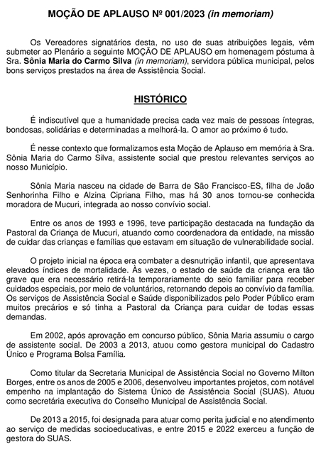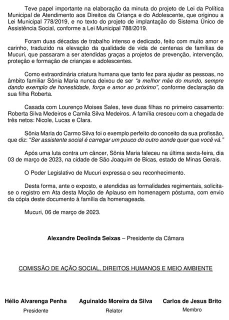 Veja abaixo a íntegra da Moção de Aplauso nº 001/2023, autoria do presidente da Câmara, Alexandre Deolinda Seixas (Xandão Seixas – PSC) e dos Vereadores que integram a Comissão de Ação Social, Direitos Humanos e Meio Ambiente: Hélio Alvarenga Penha (Dr. Hélio – PSDB), presidente; Aguinaldo Moreira da Silva (Aguinaldo Sem Teto – PSD), relator, e Carlos de Jesus Brito (Carlinhos da Ótica – Republicanos), membro.