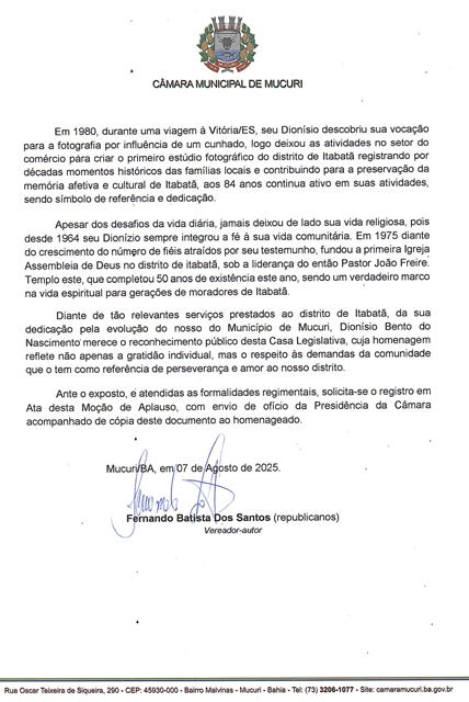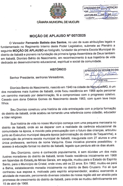 Com a sinalização positiva de todos os Vereadores que compõem a Câmara de Mucuri, nesta terça-feira (19/08) foi aprovada a Moção de Aplauso nº 007/2025, autoria de Fernando Batista dos Santos (Fernando da Gazzinelli – Republicanos), que homenageia o sr. Dionísio Bento do Nascimento, em reconhecimento à sua trajetória de vida e pioneirismo no distrito de Itabatã.