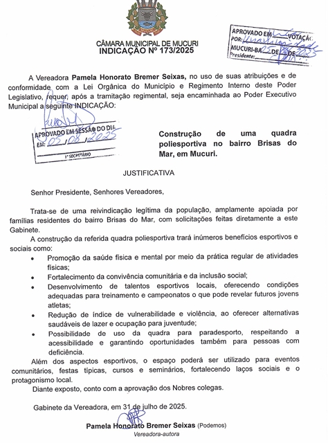 Trata-se de uma reivindicação legítima da população, amplamente apoiada por famílias residentes do bairro Brisas do Mar, com solicitações feitas diretamente ao gabinete da Vereadora.