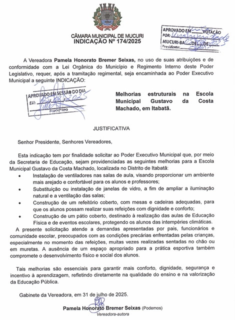 Entre os benefícios, Pamela cita instalação de ventiladores nas salas de aula, visando proporcionar um ambiente mais arejado e confortável para os alunos e professores; substituição ou instalação de janelas de vidro, a fim de ampliar a iluminação natural e a ventilação das salas; construção de um refeitório coberto, com mesas e cadeiras adequadas, para que os alunos possam realizar suas refeições com dignidade e conforto; e construção de um pátio coberto, destinado à realização das aulas de Educação Física e de eventos escolares, protegendo os alunos das intempéries climáticas.
