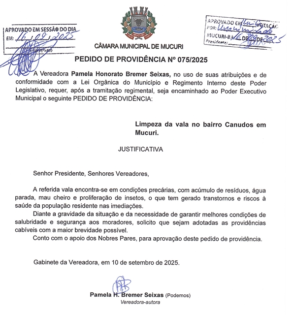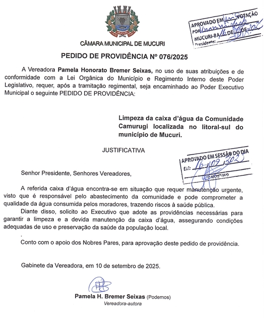 Dois Pedidos de Providências de autoria da Vereadora Pamela Honorato Bremer Seixas (Pamela Seixas – Podemos) foram aprovados na reunião de terça-feira (16/09), em atendimento às constantes reclamações por parte dos moradores de Mucuri-sede.