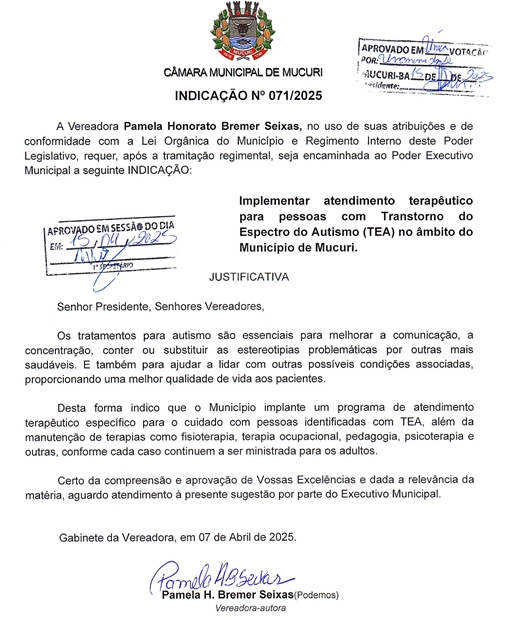 Assunto: Implementar atendimento terapêutico para pessoas com Transtorno do Espectro do Autismo (TEA) no âmbito do Município de Mucuri.