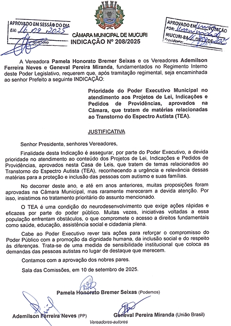 O Poder Executivo Municipal precisa responder com prioridade no atendimento aos Projetos de Lei, Indicações e Pedidos de Providências, aprovados na Câmara, que tratem de matérias relacionadas ao Transtorno do Espectro Autista (TEA). A cobrança foi feita durante a reunião de terça-feira (16/09), por meio da Indicação nº 208/2025, assinada por Pamela Honorato Bremer Seixas (Pamela Seixas – Podemos) , Ademilson Ferreira Neves (Dema – PP) e Geneval Pereira Miranda (Valzinho Embalador – União Brasil). Todos os Vereadores presentes aprovaram a matéria.