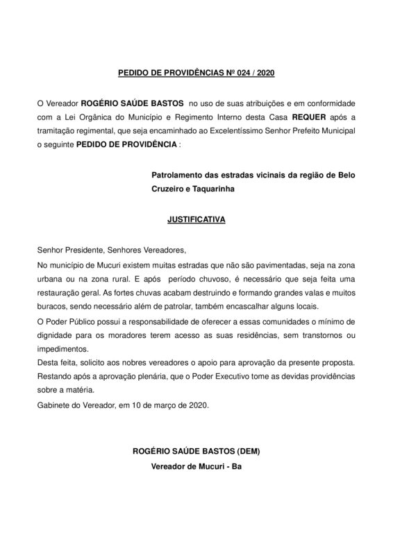A necessidade de patrolamento das estradas vicinais nas imediações do povoado de Belo Cruzeiro e do distrito de Taquarinha foi reivindicada pelo Vereador Rogério Saúde Bastos (Rogério de Nicó – DEM), por meio da Indicação nº 024/2021.