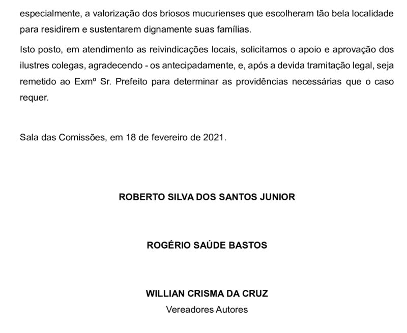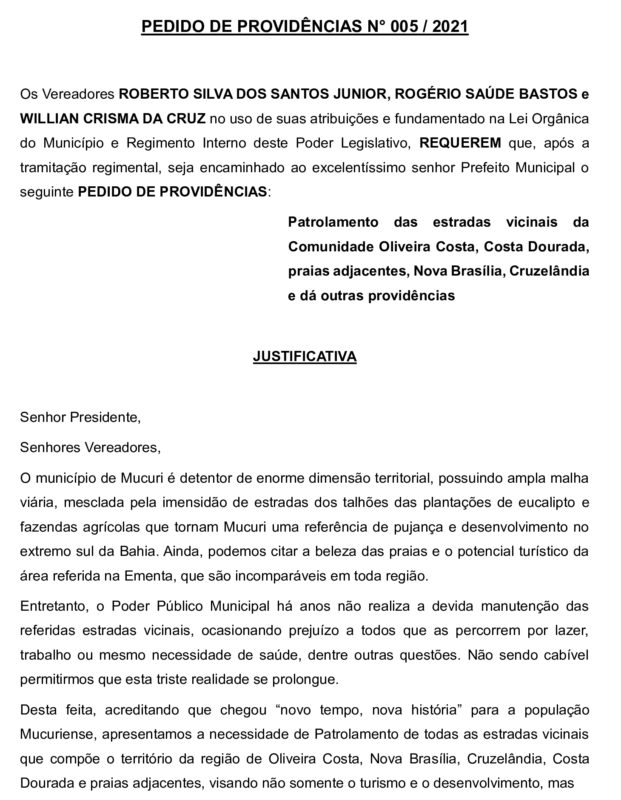 Aprovado por unanimidade na Reunião Ordinária desta terça (9) o Pedido de Providência nº 005/2021, autoria conjunta dos Vereadores Roberto Silva dos Santos Junior (DEM), Rogério Saúde Bastos (DEM) e Willian Crisma da Cruz (Republicanos), que cobra do Prefeito os serviços de patrolamento das estradas vicinais da Comunidade Oliveira Costa, Costa Dourada, praias adjacentes e dos povoados de Nova Brasília e Cruzelândia.