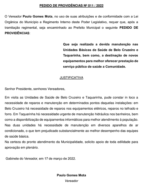 Na reunião de terça-feira passada (22), foi aprovado por unanimidade o Pedido de Providência nº 011/2022, de autoria do Vereador Paulo Gomes Mota (Paulo do Carvão – PSB), 2º Secretário da Mesa Diretora da Câmara, que cobra do Prefeito um permanente trabalho de manutenção nas Unidades Básicas de Saúde de Belo Cruzeiro e Taquarinha, bem como, a destinação de novos equipamentos para melhor oferecer prestação de serviço público de saúde à comunidade.