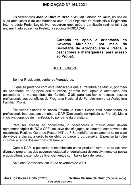 O documento cobra garantia de apoio e orientação do Governo Municipal, por meio da Secretaria de Agropecuária e Pesca, a pescadores e marisqueiras, para acesso ao Pronaf (Programa Nacional de Fortalecimento da Agricultura Familiar).