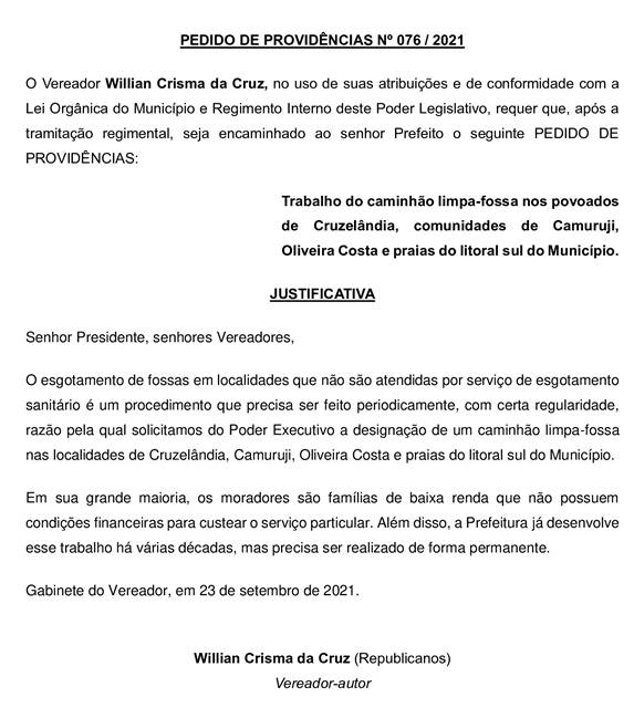 Outra proposição do Vereador foi o Pedido de Providência nº 076/2021, que solicita trabalho do caminhão limpa-fossa nos povoados de Cruzelândia, comunidades de Camaruji, Oliveira Costa e praias do litoral sul do Município.